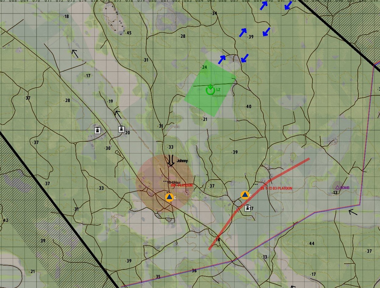 - Dwie drużyny zmechanizowane na południe od miejscowości "Johny" oznaczone są czerwoną kreską jako "2x BMP-1 Squads".